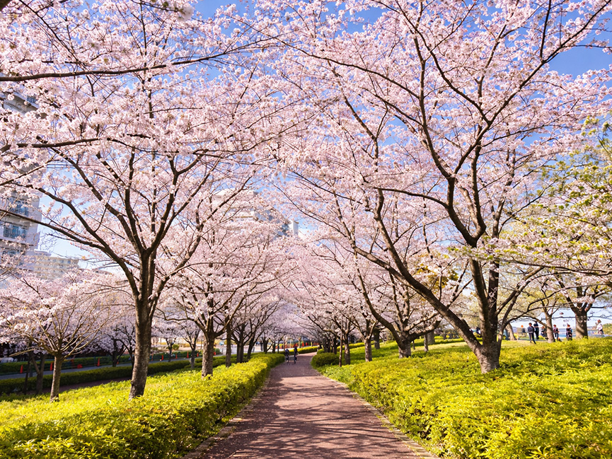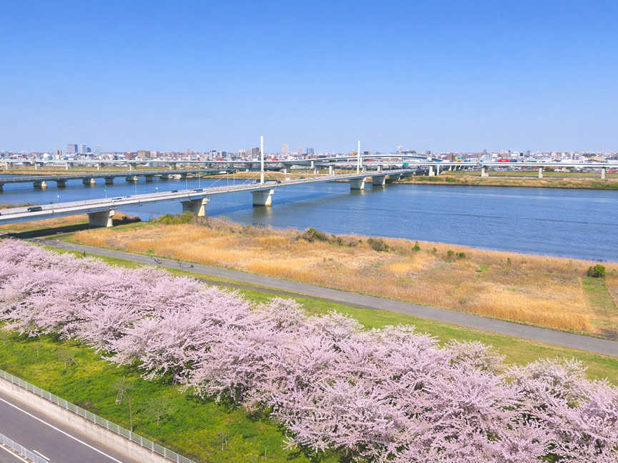 荒川沿いに並ぶ桜並木の「小松川千本桜」が目の前に広がっています。